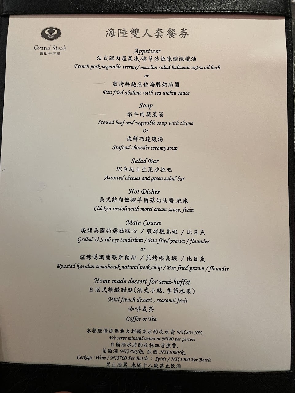 晚餐用餐只給套餐菜單,都點完一輪,才看到隔壁桌有點單點的pizza,低消980,我們七個人一共點了17000,其實不像貢盤子,更像是在貢北七,看你第一次來,當肥羊狠狠宰,沙拉吧食材是好的,套餐的牛肉湯感覺用的是不太新鮮的邊角料,主餐的5分熟牛排也煎得像接近全熟,不會不好吃,但就是不會再特地上山去吃了,提醒大家