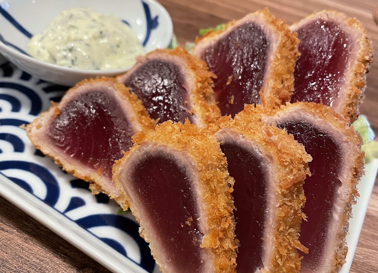招牌是炸半熟鮪魚,外皮是吃起來微鹹、口感酥脆的炸麵包粉(日式炸豬排的外表),但裡面包的是軟嫩的鮪魚生魚片,推薦敢吃生魚片的人點來試試。