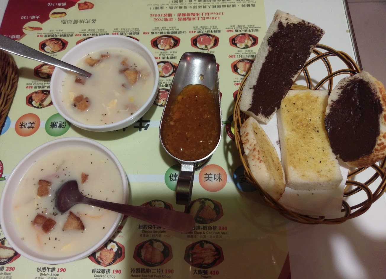 牛排、沙拉吧、濃湯、醬料、飲料、烤土司(巧克力、香蒜、花生)、咖啡、冰淇淋。