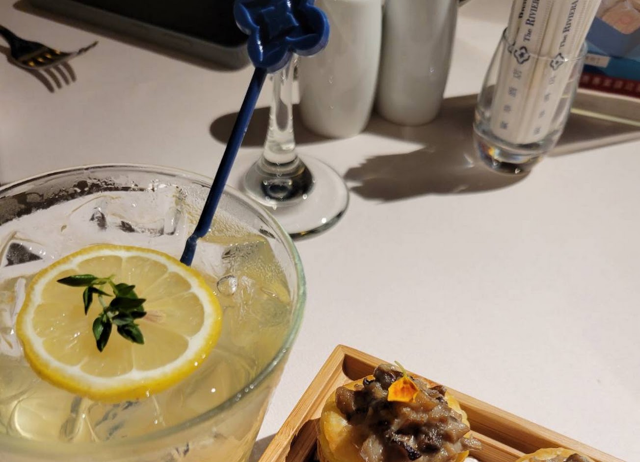飲料:套餐就有附氣泡水不用另外點真的很服務周到,調酒的話因為不太能喝酒點的是無酒精的水蜜桃氣泡水,有很多果汁的口感但水蜜桃醬的部分就是中規中矩。