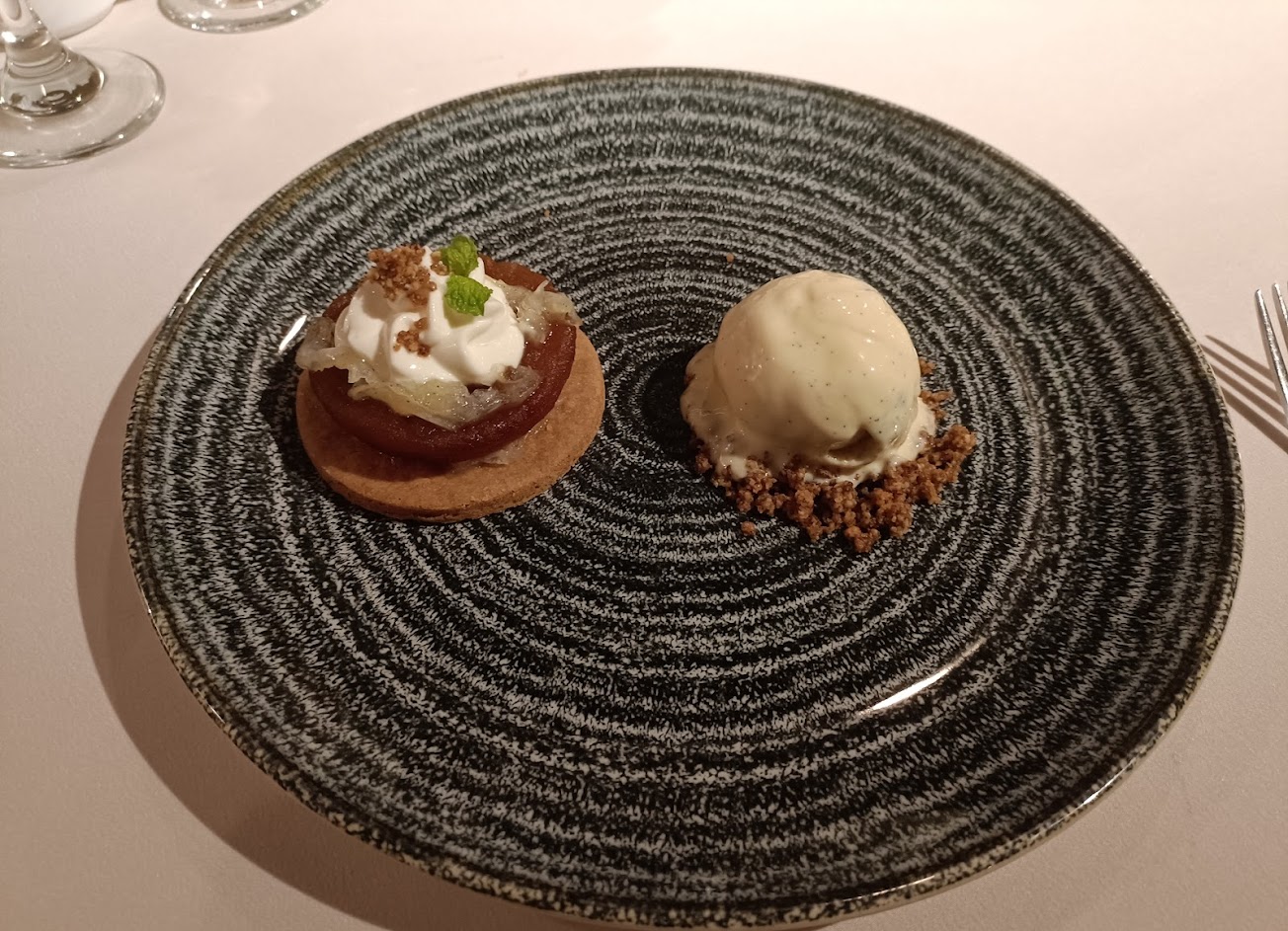 點心:點的是無花果的點心,醬有點酒味酸酸甜甜的很解膩,有點水果牛奶的感覺,蘋果派跟冰淇淋還有餅乾碎,口感很豐富。
