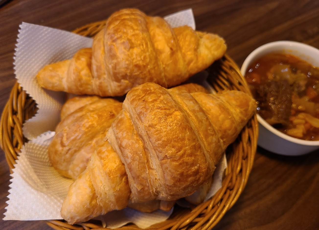 可頌好吃~排餐雙拼份量很足,使用Gomaji餐券很划算,自助吧的玉米濃湯和牛肉蔬菜湯都好好喝!料很多?假日下午生意很好,一直有客人陸續來