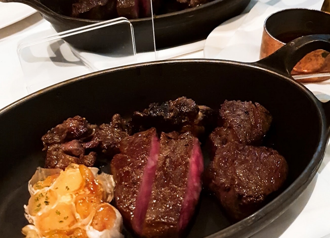 同行三人點了 1.日本和牛菲力150g 加點香煎鴨肝, 配酸甜孢子甘藍, 前菜手切日本和牛韃靼, 煙燻鯖魚沙拉. 2. 美國Flannery牛排200g兩人份配原味薯條+爐烤蒜味奶油野菇, 前菜香煎干貝+香煎虎蝦, 法式蟹肉濃湯, 甜點蕃茄三重奏+紅玉舒芙蕾+焦糖燒乳酪.