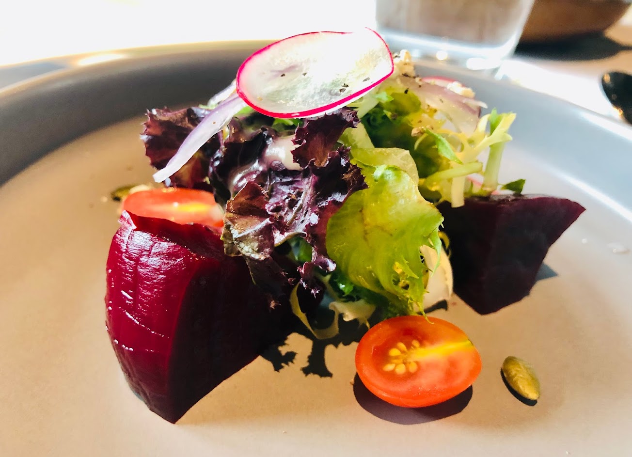 沙拉有堅果跟優格兩種,堅果沙拉主要是甜菜根加一些萵苣洋蔥,優格是大片的蘿美生菜。