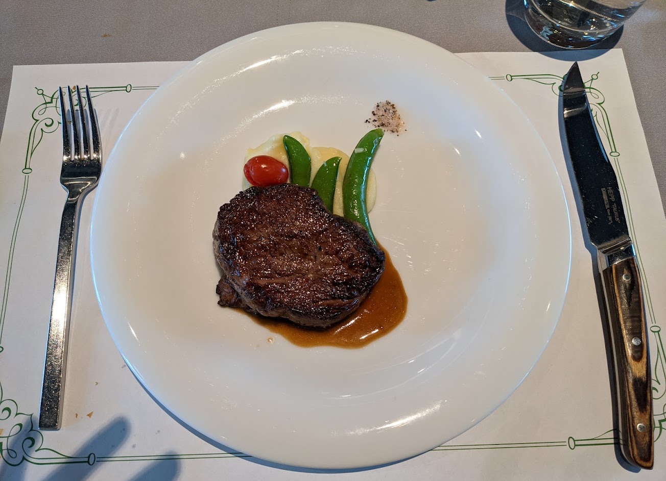 同時也會換上牛排刀,牛排刀是使用德國的HEPP TAURUS,木質手柄很好拿,刀面鋒利好切,但剛給的時後有水痕,配一般餐叉也很可惜。