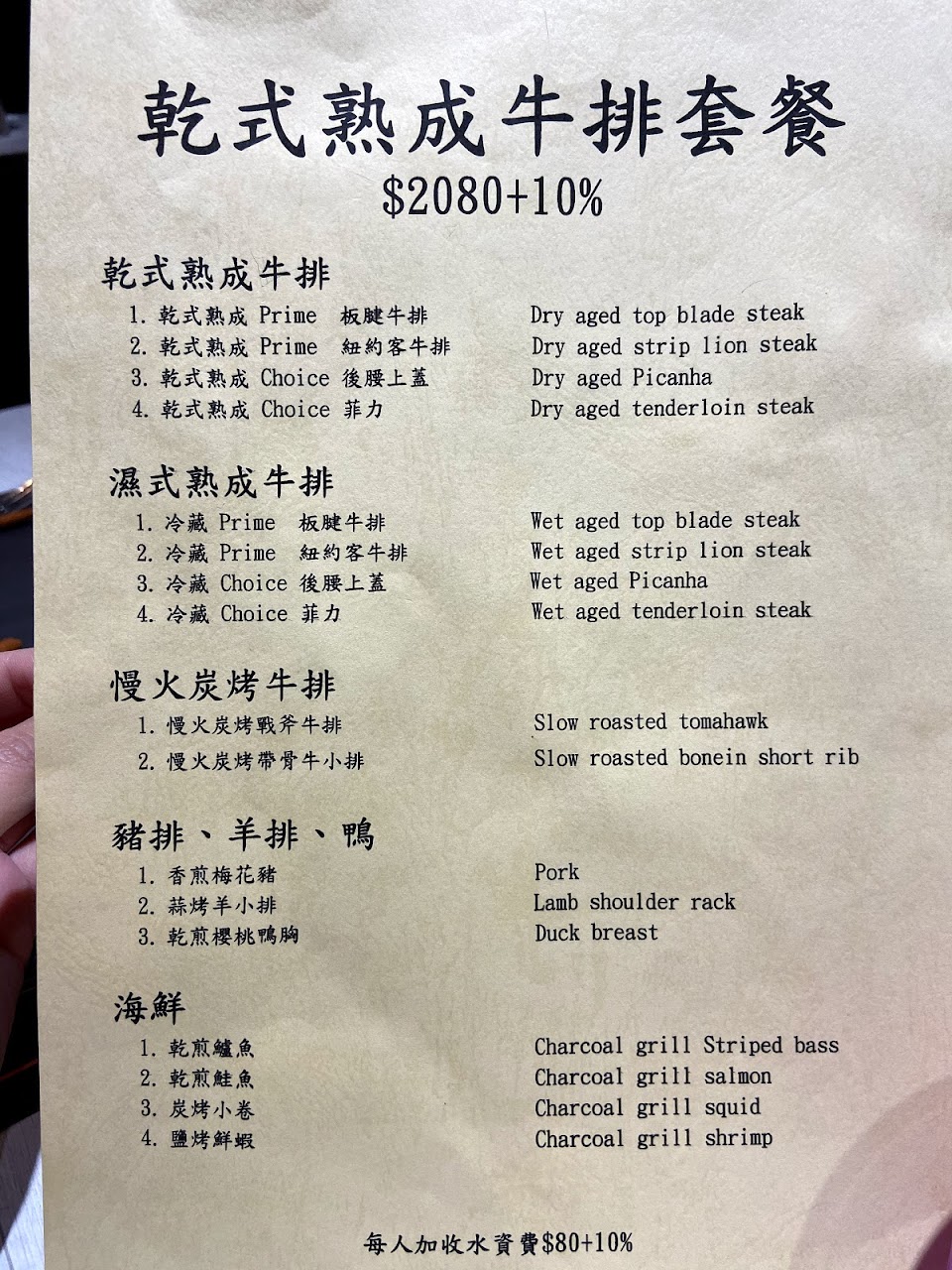 熟成牛排吃到飽感覺很不錯,乾式偏乾硬,濕式口感偏軟嫩,我個人是喜歡吃濕式,我點的是2080,可以吃到各式各樣的排餐,肉讓你吃到怕XD,服務很貼心,戰斧牛排也給的很有誠意,甜點很滿意,很推的一家餐廳。