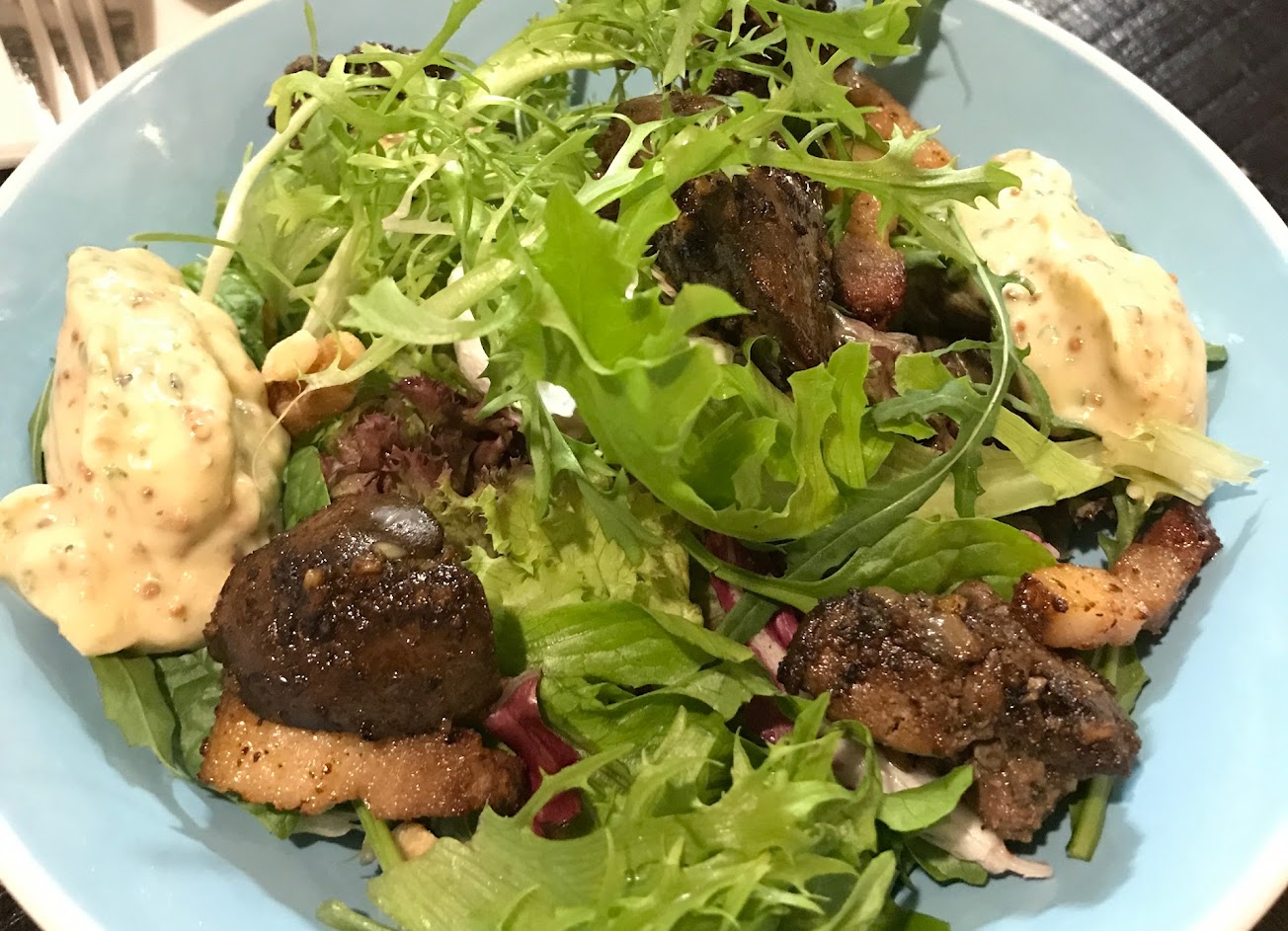 前菜:里昂沙拉加水波蛋,祕製油醋醬味道清爽,並添加炒過的軟培根及雞肝,別有滋味;