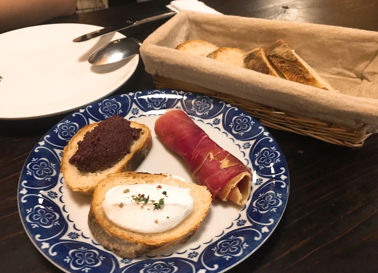三種當日新鮮蔬菜、地中海橄欖醬、烤吐司片搭配烘烤至溶化的山羊起司(crottin de chevre),混合法式辣椒粉、新鮮香草、喜馬拉雅玫瑰鹽。