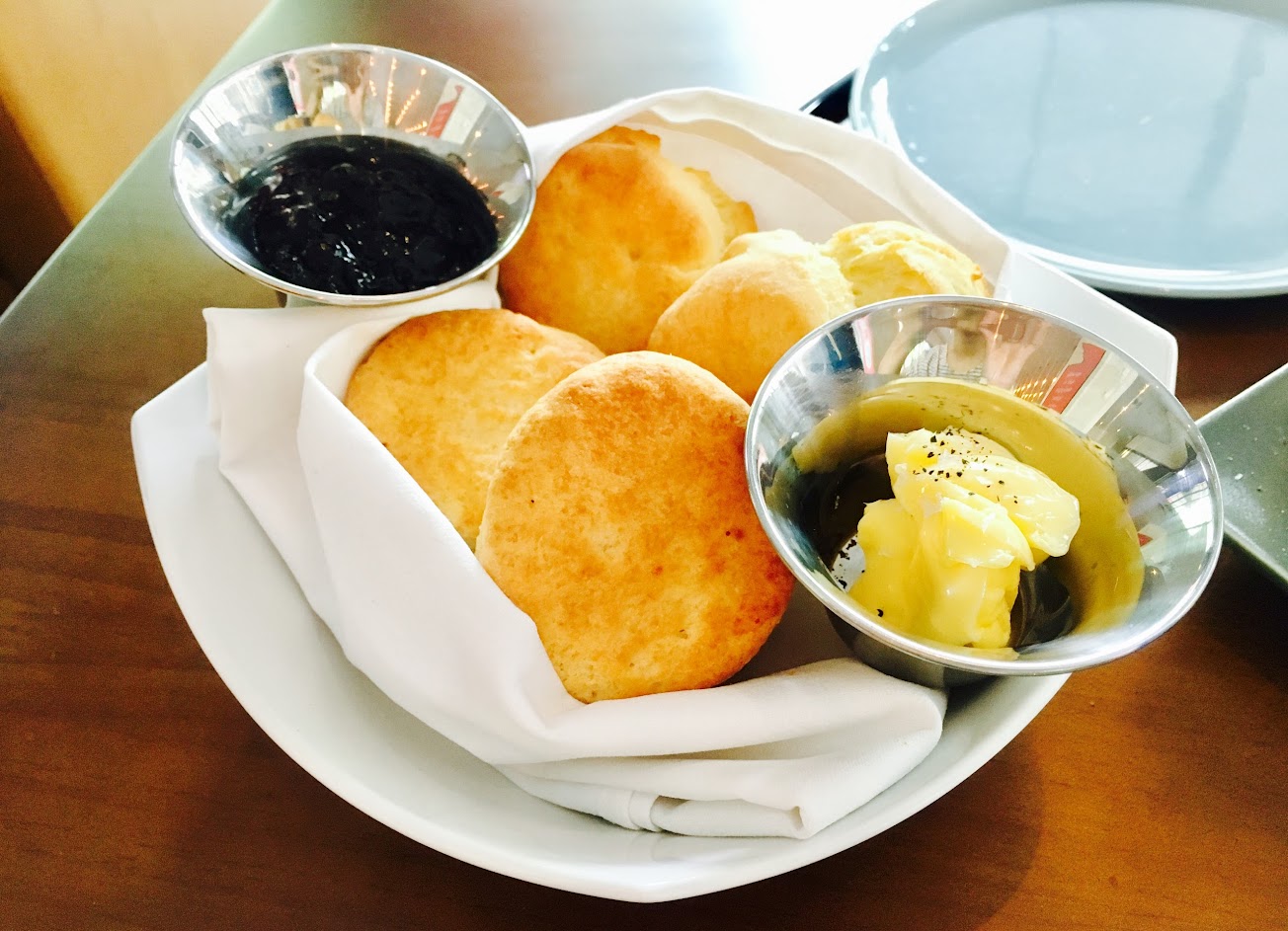 -比司吉:奶油味很重,趁熱吃很香,口感鬆軟,搭配藍莓醬很好吃