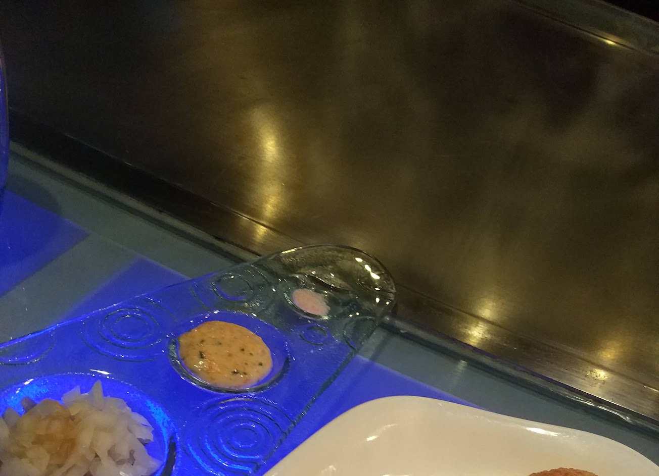 比預期感覺要好。菲力牛肉不錯,不過,如果切片可以厚一點,應該會更好。在日本吃鐵板燒都有筷子,我覺得筷子更合適。香檳太甜,波士頓龍蝦肉質算不錯(蝦殼不是很堅硬,應該有一點時間了),也很划算,不過口味偏鹹。甜點部分 我想應該很有再加強,不是很有特色。最後羅宋湯 可以再清爽一點,太油了。