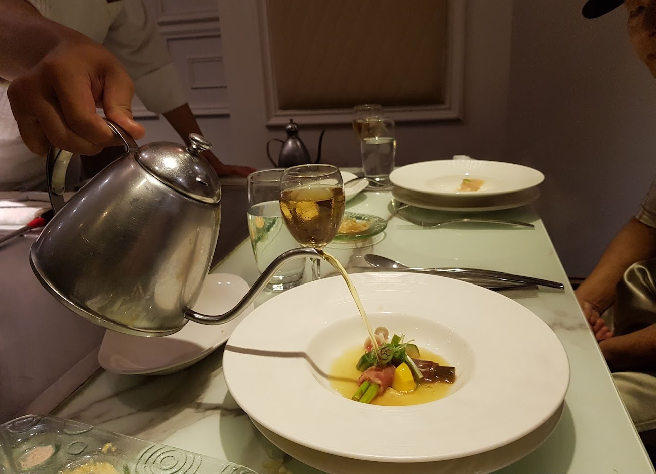 一踏進店門口,映入眼簾的是臭臉服務生,可能客人太多導致完全沒有笑容,等候區座位太少,一堆人必須站著,而且店內超熱會導致客人加速等候不耐煩,幫我們服務的小姐可能是新來的,速度稍嫌不足,但至少比櫃檯有笑容多了,鐵板師傅就比較嚴肅不苟言笑,但是對於客人菜色不懂會非常有耐心講解,值得加許,這次點的是一般鐵板燒套餐1090,比起五六年前漲價不少,但是美味度卻每況愈下,麵包本身無味,但是加上麵包醬有點類似明太子醬增色不少,整個變很好吃,熱前菜是蒸蛋及時令海鮮,蒸蛋非常普通,裡頭完全沒料也沒什麼味道,時令海鮮是蝦子及鳳梨,蝦子普通,鳳梨超酸,熱前菜很沒什麼驚艷,湯品海鮮清湯及牛肉湯都很好喝,師傅會直接現倒熱湯在你面前,肉質非常好吃,湯頭也清甜,沙拉點了松露百菇沙拉,杏鮑菇非常多汁鮮甜好吃,另外的水果沙拉就一堆蘋果略顯普通,檸檬沙瓦就解膩,酸酸甜甜普普通通,香檳酒還不錯,不死甜,主餐點了里昂雞排,海鮮,有鮭魚及干貝還有雞腿排,完全沒什麼特別的,很普通的一道主餐,鴨胸反而意外好吃,肉質硬中帶軟,很有嚼勁,香氣十足,松阪豬也是亮點,師傅會料理三種不同的口味,第一次是清蒸搭配剝皮辣椒,比較沒什麼味道,第二次及第三次有特殊醬料及煎法非常好吃且份量非常飽足,隨餐附贈的櫻花蝦炒飯吃起來非常有香氣,另外花499元加點了龍蝦,龍蝦必點,肉質鮮甜,而且有海水的鹹味完全不會像鹽巴的死鹹,吃完熟食服務生會帶我們去另一區享用甜點,但是必須說我們等了半小時才等到我們的甜點,時間太久了,甜點點了紅玉布蕾及草莓慕斯珠寶盒,完全很雷不好吃,布蕾上頭的焦糖太苦了,珠寶盒也是說不上來好吃,飲料點黑岩伯爵奶茶也是說不上來的不好喝,整體覺得跟印象中好幾年前來過的感覺差很多,用完餐也不會關心我們用餐滿意度如何,服務及食物都每況愈下,價錢漲了期待值卻呈反比,非常可惜,下次可能會改換墨賞鐵板燒吃看看