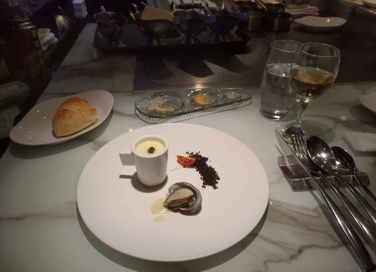 台北老土第一次去夏慕尼,有別於傳統的鐵板燒,走法式精緻路線,但少了看著師傅為你做菜直接熱騰騰送到面前的氛圍感。也可能是我們的座位剛好在最旁邊,一直看到的是師父在疊盤子,然後一一分菜擺盤的畫面,比較感受不到鐵板燒的溫度~不過它本來就不是走傳統路線的,也是可以理解。