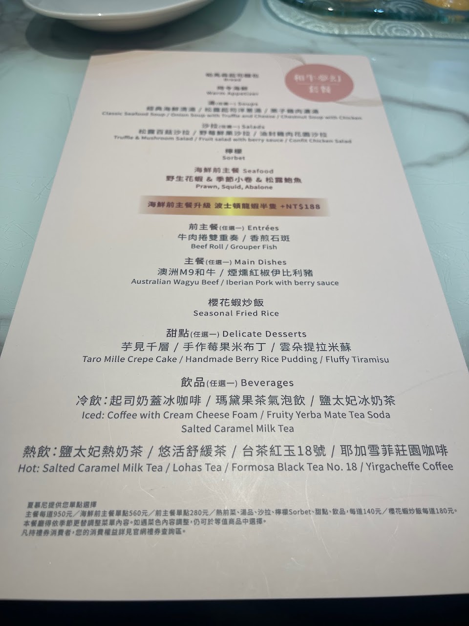 被漂亮的DM吸引,點了夏慕尼跟歐舒丹獨家聯名的「夢幻和牛套餐」,整體來說應該算正常發揮。比較喜歡的是它的天使紅蝦海鮮清湯跟櫻花蝦炒飯,平常不吃米飯的我,忍不住吃完了!