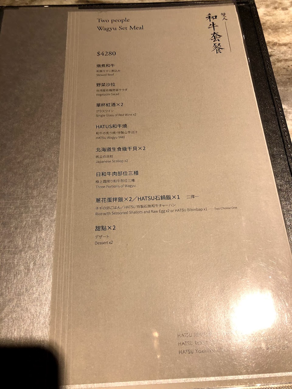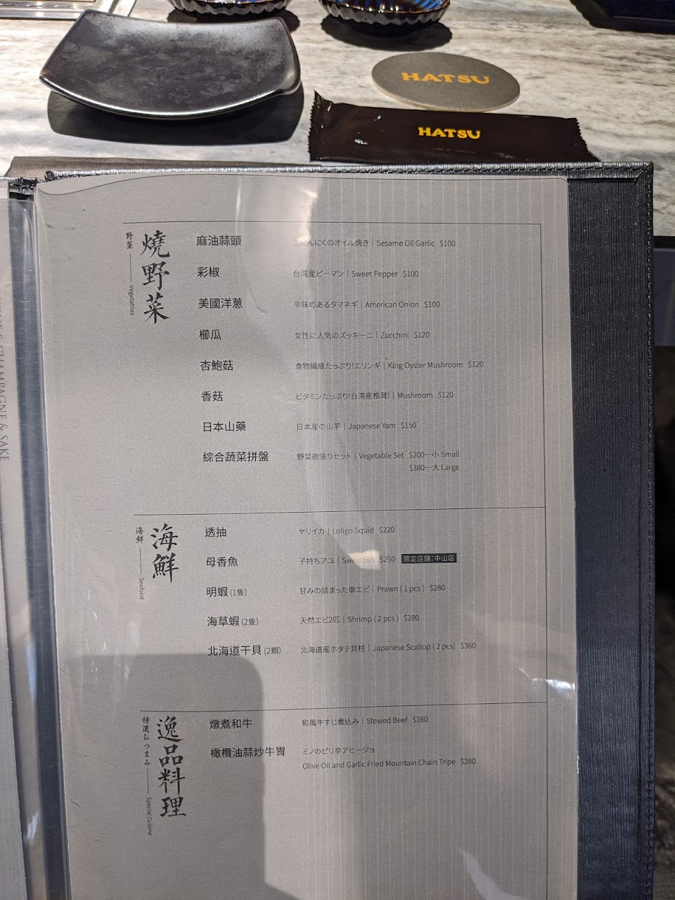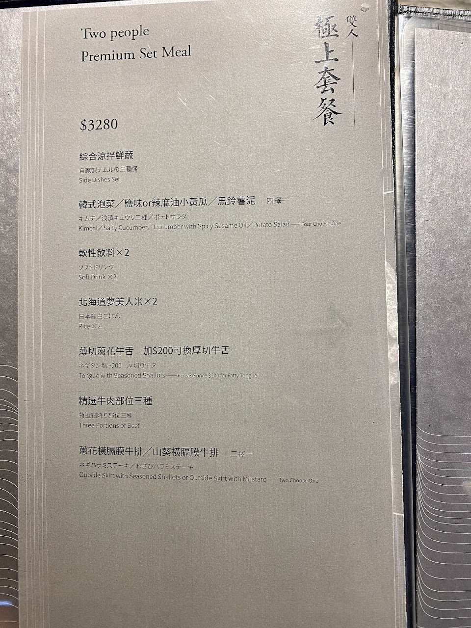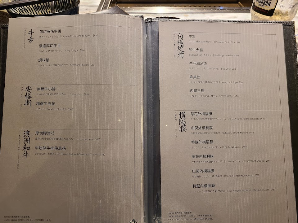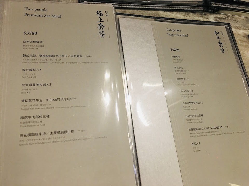 2. 餐點: 菜單上A5和牛只有兩種 (牛五花 & 牛小排) 選擇很少,還不錯。紐澳和牛差到不行,很久沒在高單價燒肉店吃到這麼難吃的牛舌。日本國產牛紐約客還不錯,其他品項真的是沒什麼吸引人的地方。沙拉很普通、韓式泡菜還不錯、蛋花湯不錯、干貝跟蝦不錯、雞肉普通