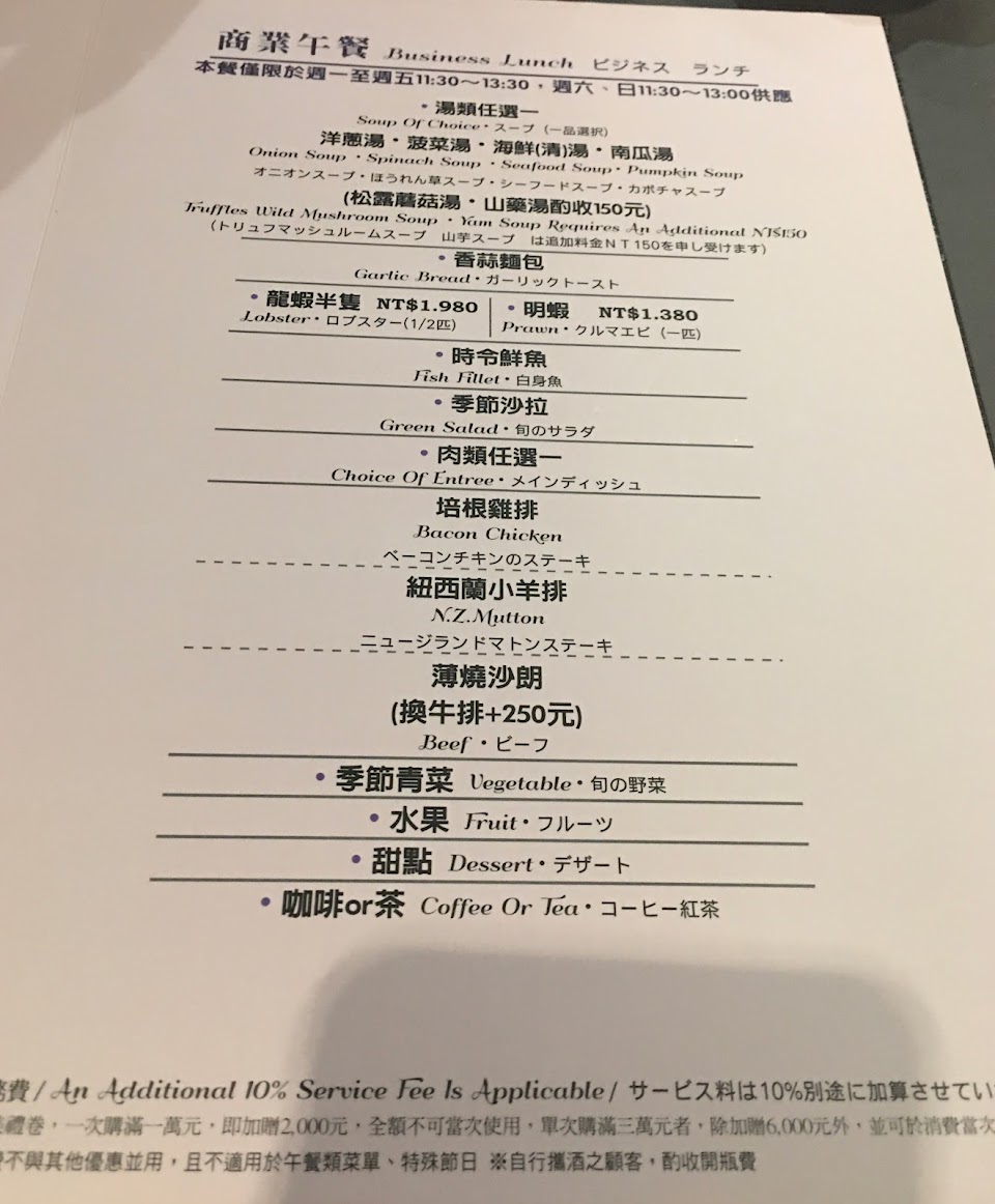 整體來說湯、麵包、沙拉都還好,肉質也還好,不管精選或商業午餐的都很普通,精選的另外兩個主菜(包含龍蝦)也沒有太驚艷,但高麗菜真的滿好吃的,最後的甜點滿失望的,不知道為什麼這次吃下來,只有對高麗菜有覺得好吃。