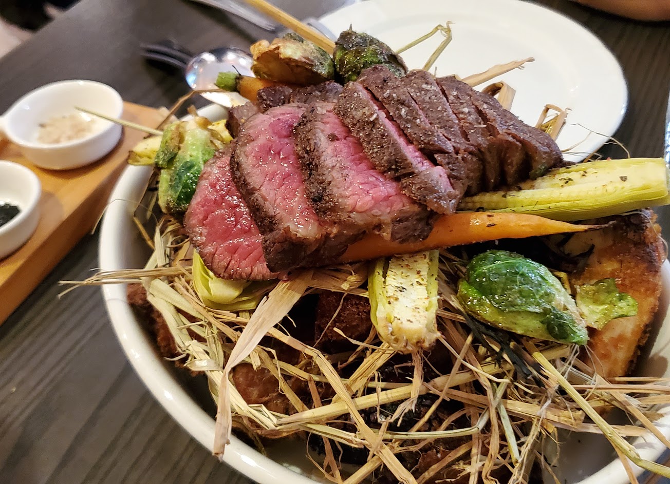 稻燻牛排肉質軟嫩,香氣一般;脆皮豬肋肉質軟而細緻,味道清淡,外皮香酥;鮭魚卵小卷微辣香甜又不老柴,口味較重鹹,非常適合配酒;松露爆米花味道衝突口感不佳;整體價位偏高。