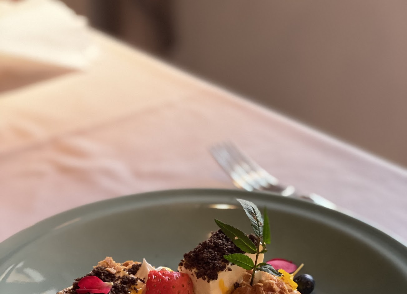 甜點也很喜歡,“芒果慕斯派”酸甜適中、不膩,旁邊的派皮碎片搭上碾碎、微酸的果乾,剛好解了油膩,給了完美的ending!