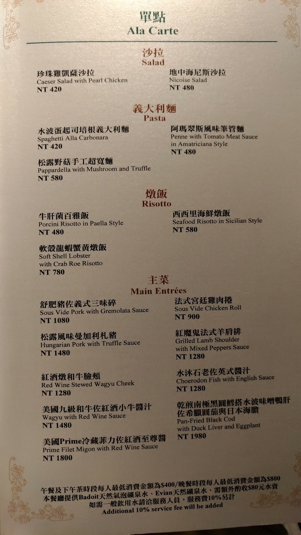 最後想說的是,可能是我經驗不多,見識比較短淺,上整隻白酒放到冰鎮後一段時間,沒有人來幫我們倒酒,後來是我們去請那位先生幫忙,第一杯酒才是由他倒進酒杯,但在我的印象裡,紅白酒上來第一杯由服務生斟滿,應該不是太過分的要求。