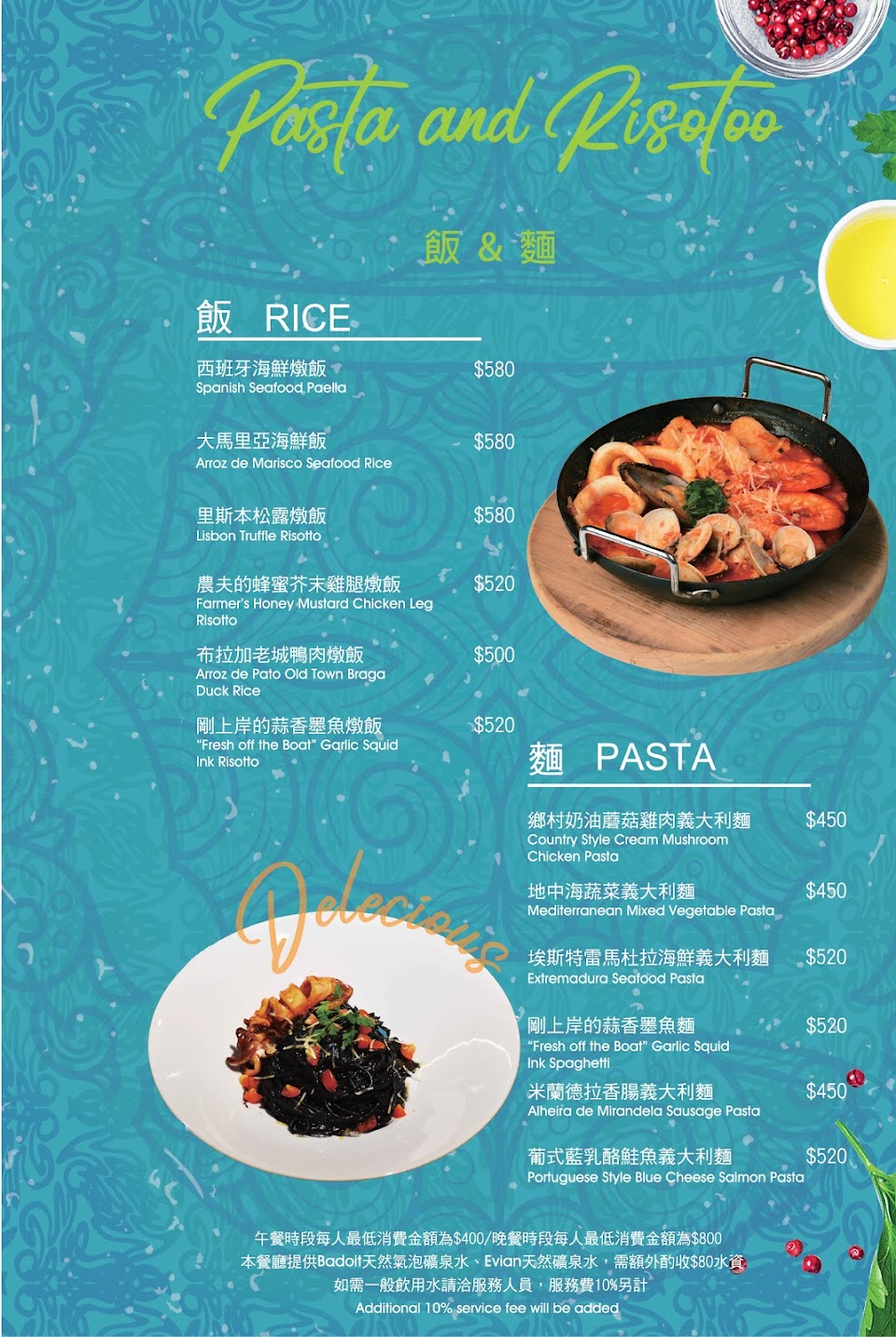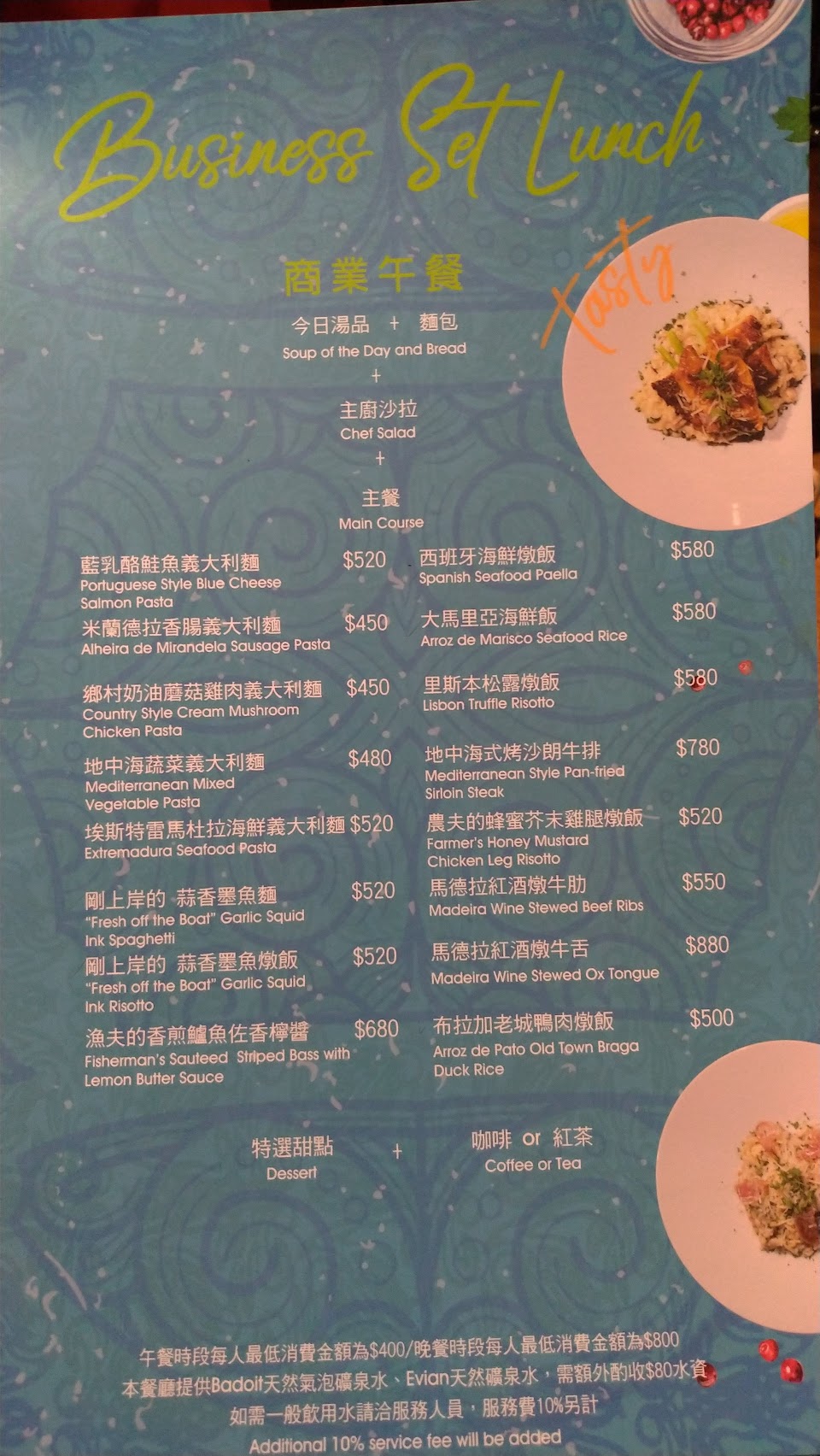 [特色]週間中午來餐廳用餐,中午只有提供商業午餐,是在地下酒窖用餐。商業午餐為套餐形式,包含了水資、生菜、例湯與主餐,主餐大部分是義式料理如義大利麵或是燉飯,餐點表現中規中矩,加100元會有一杯紅白酒。海鮮燉飯由三塊魚、三隻蝦與三塊透抽,起司味濃郁。墨魚麵是由墨魚汁與墨魚組成,整體看起來不錯。