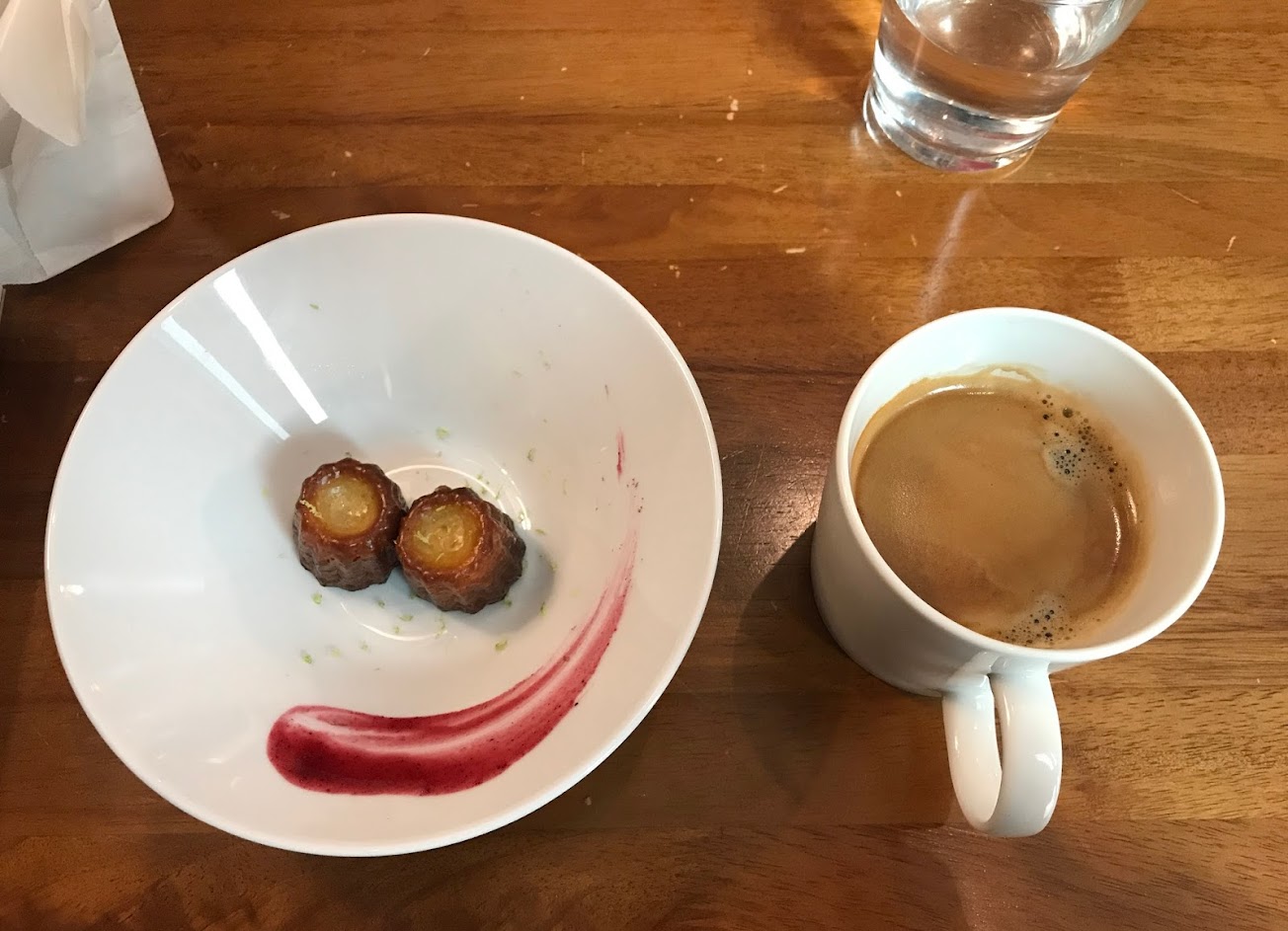 長棍、紅蘿蔔濃湯都好吃。主菜的桂丁雞也相當不錯,但米心希望可以再軟一點點,整體也是相當不錯,很大盤適合兩人分食不然也會膩(雞香+(鮮)奶油香)。沙拉也精緻(雞胸用舒肥口感很不一樣、小番茄有先蜜漬過、糖心蛋)。小點可麗露+黑咖啡就覺得普通一些了