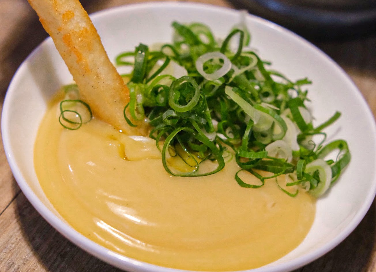 首先上來的是蒜味薯條沾香蔥雞汁美乃滋。我想以薯條來說,很少有人能打敗麥當勞了,但這間的薯條可以完勝。除了炸得很好之外,特別的雞汁醬料也溫和的刺激了我們的味蕾。