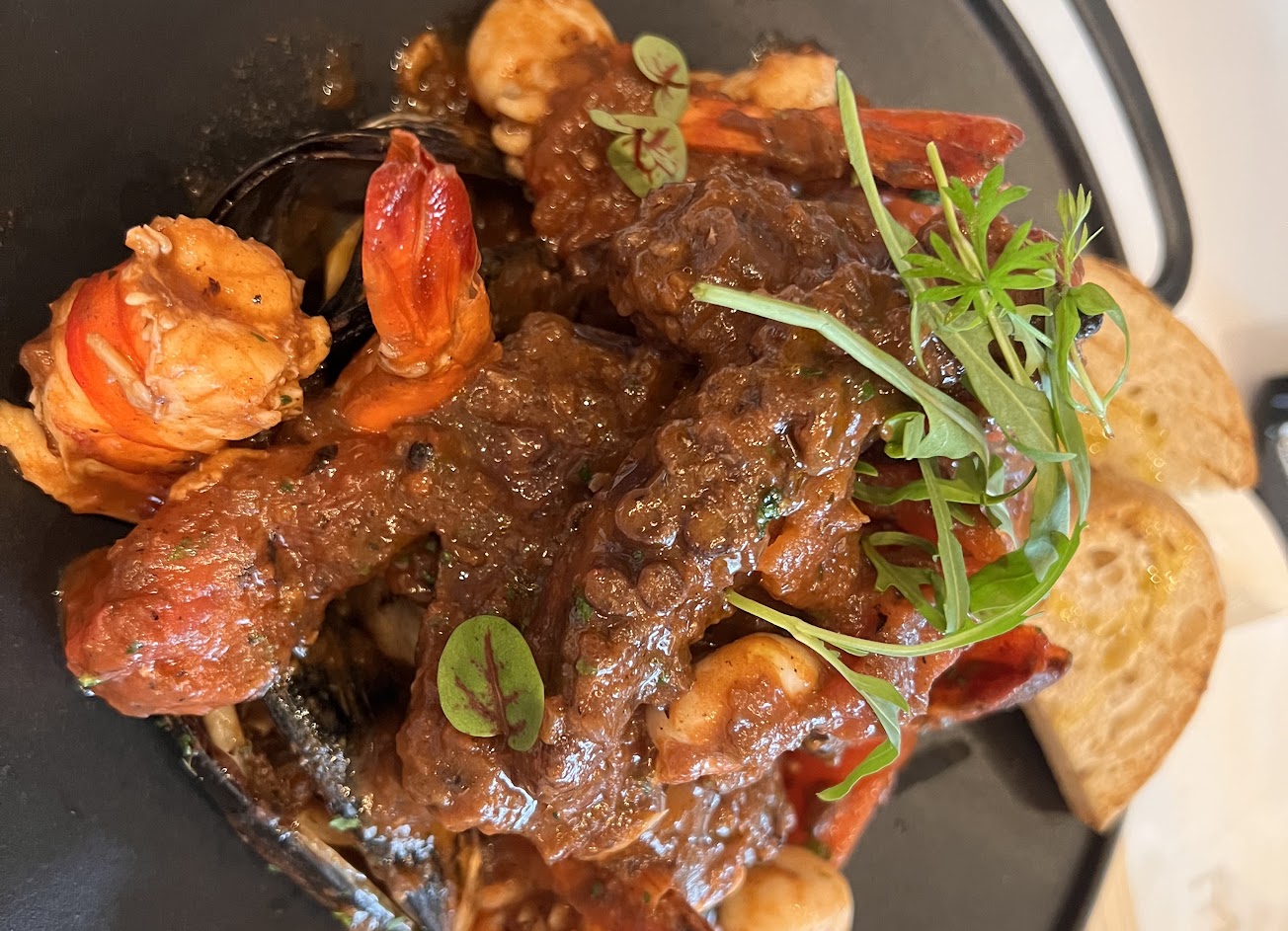 海鮮湯和海鮮燉飯的味道、配料基本上都一樣。蘑菇濃湯普通好喝。羊膝普通美味。服務可以。