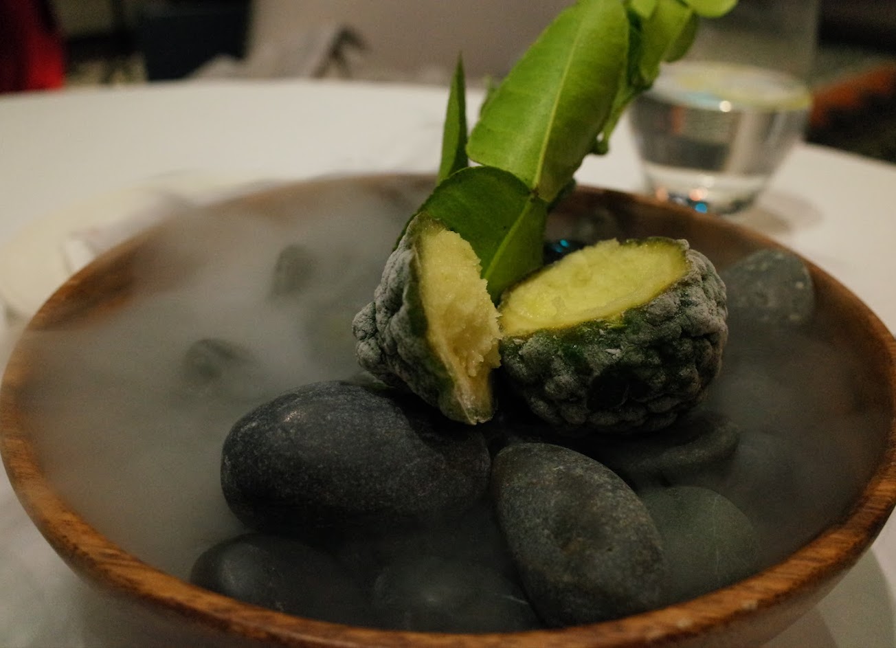 微炙鳳梨釋迦,雪松風味。終於有人拿台東釋迦這台灣最好吃的食材來作菜!釋迦用煎的到酥脆,籽的部分是用黑蒜醬填充,搭配雪松橄欖油,嘖嘖,8分。