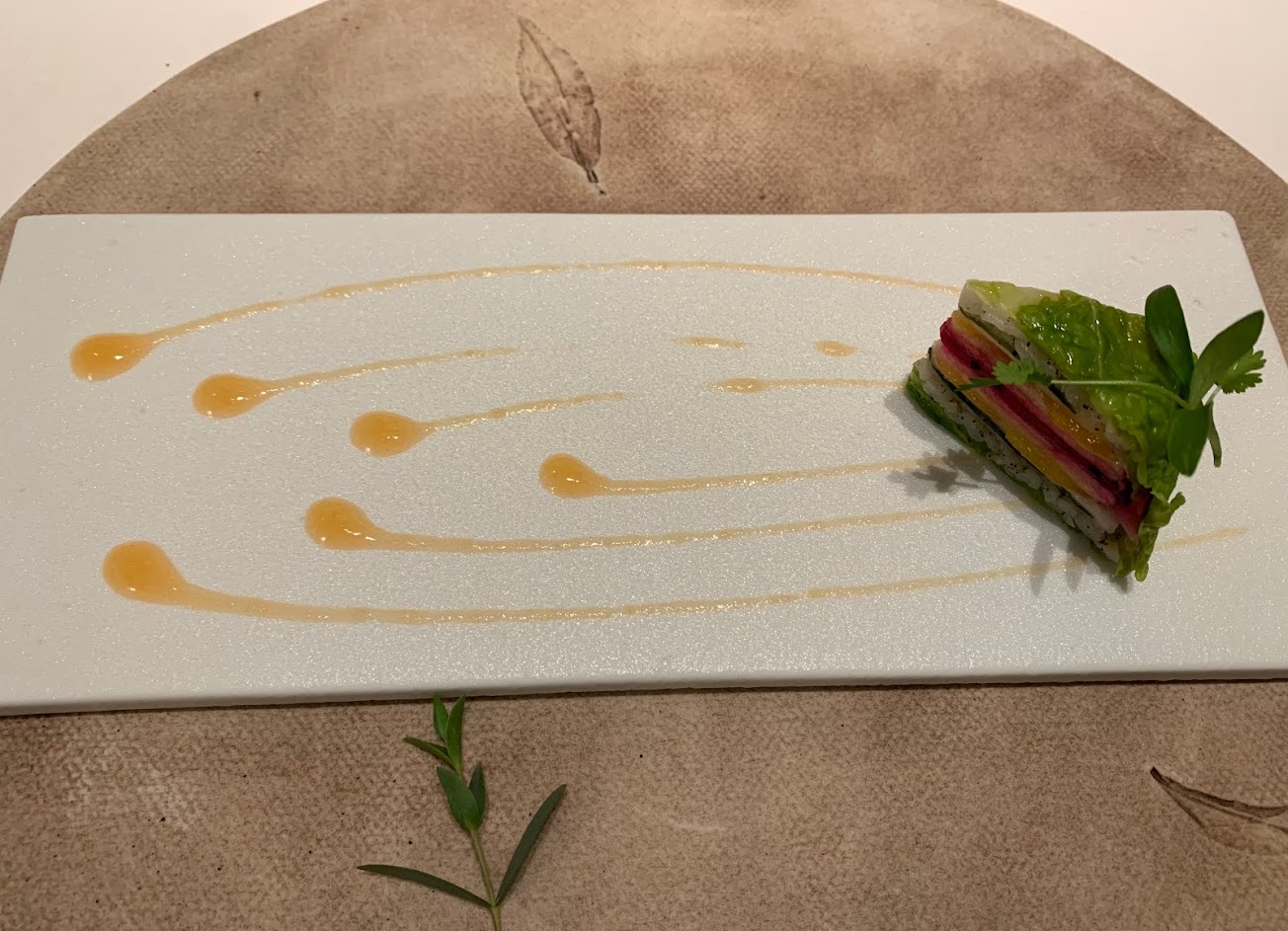 第一道季節蔬菜千層外層是以香菜苗皺葉橄欖菜搭配漬過紅烏龍茶的日本米、紫山藥、柿子、嫩薑而成也是主廚的招牌菜。