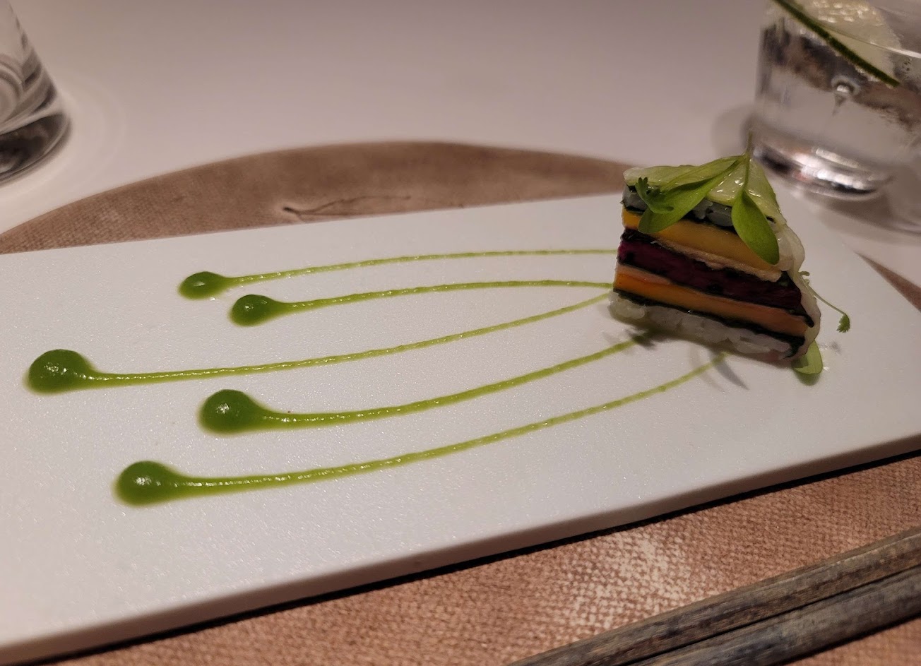 #蔬果千層 顏色超鮮豔,用上了押壽司的料理方式,加入了季節蔬果還有壽司米,搭配鳳梨醬汁,非常清爽的一道!