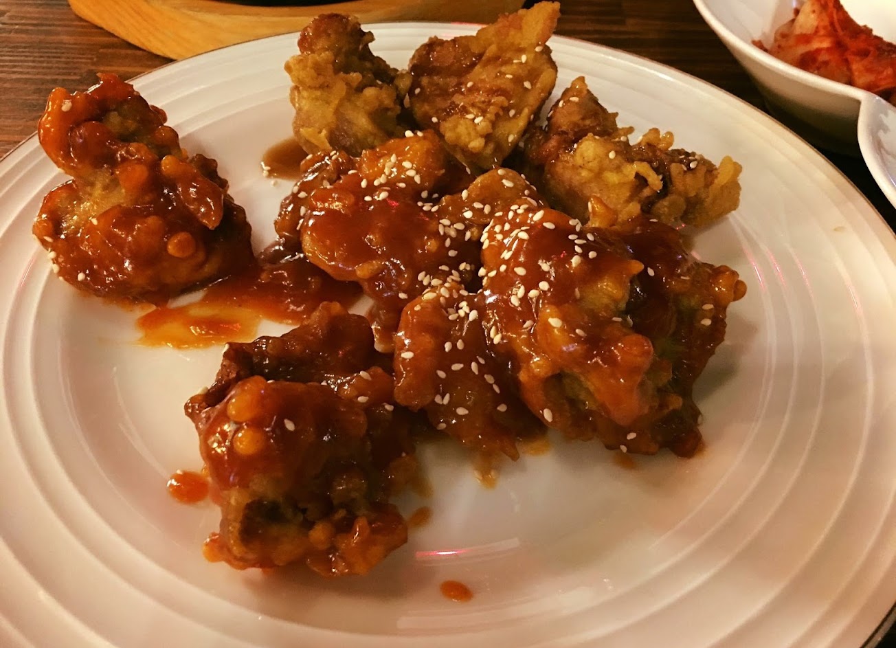 裝潢華麗不像一般的韓國炸雞店,東西好吃,老闆娘非常親切,本次品嚐起司口味及微辣的韓式炸雞,兩種都帶有甜度,但起司口味的吃起來像是撒了梅子粉的炸雞,這還蠻怪的,辣牛肉湯辣度剛好不大碗但食材飽滿,拳頭飯是招牌必點,小菜普通,還有必點的韓國水果酒真的很好喝…價位則中上.