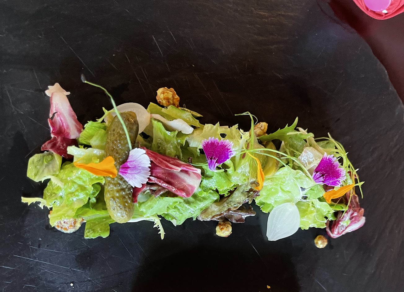 前菜的沙拉中,有著鴨內臟軟嫩卻沒有腥味