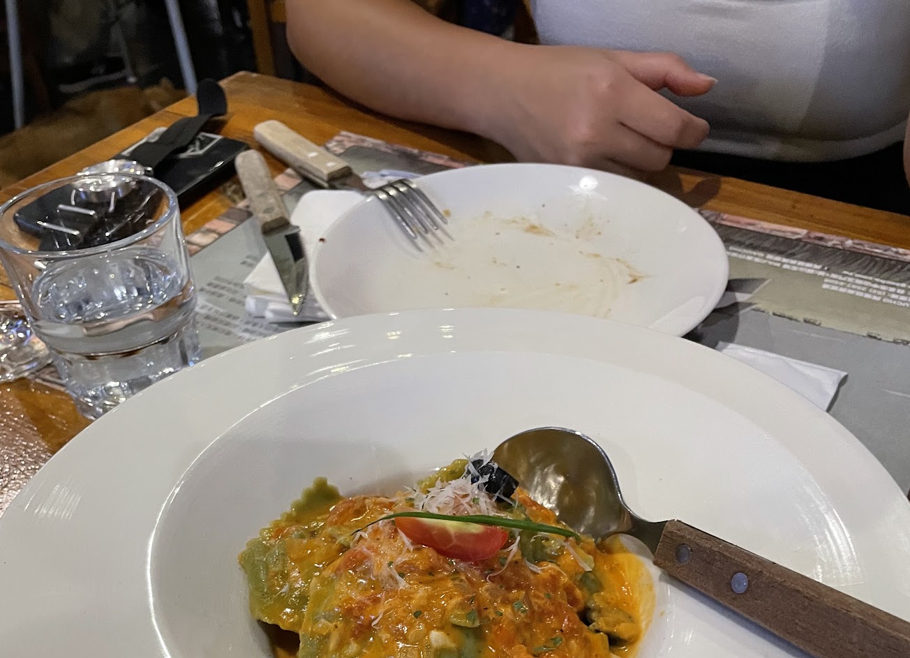 原以為端上桌的牛排會有炭香味,但有點出乎意料,吃起來就是一般灑鹽不加醬的牛排,份量也不多,而且牛排的熟度似乎更熟一些。義大利麵的粘稠度和用料佳,但製作青醬的松子或堅果可能放的比較久或已經受潮,吃的出奇怪的味道。