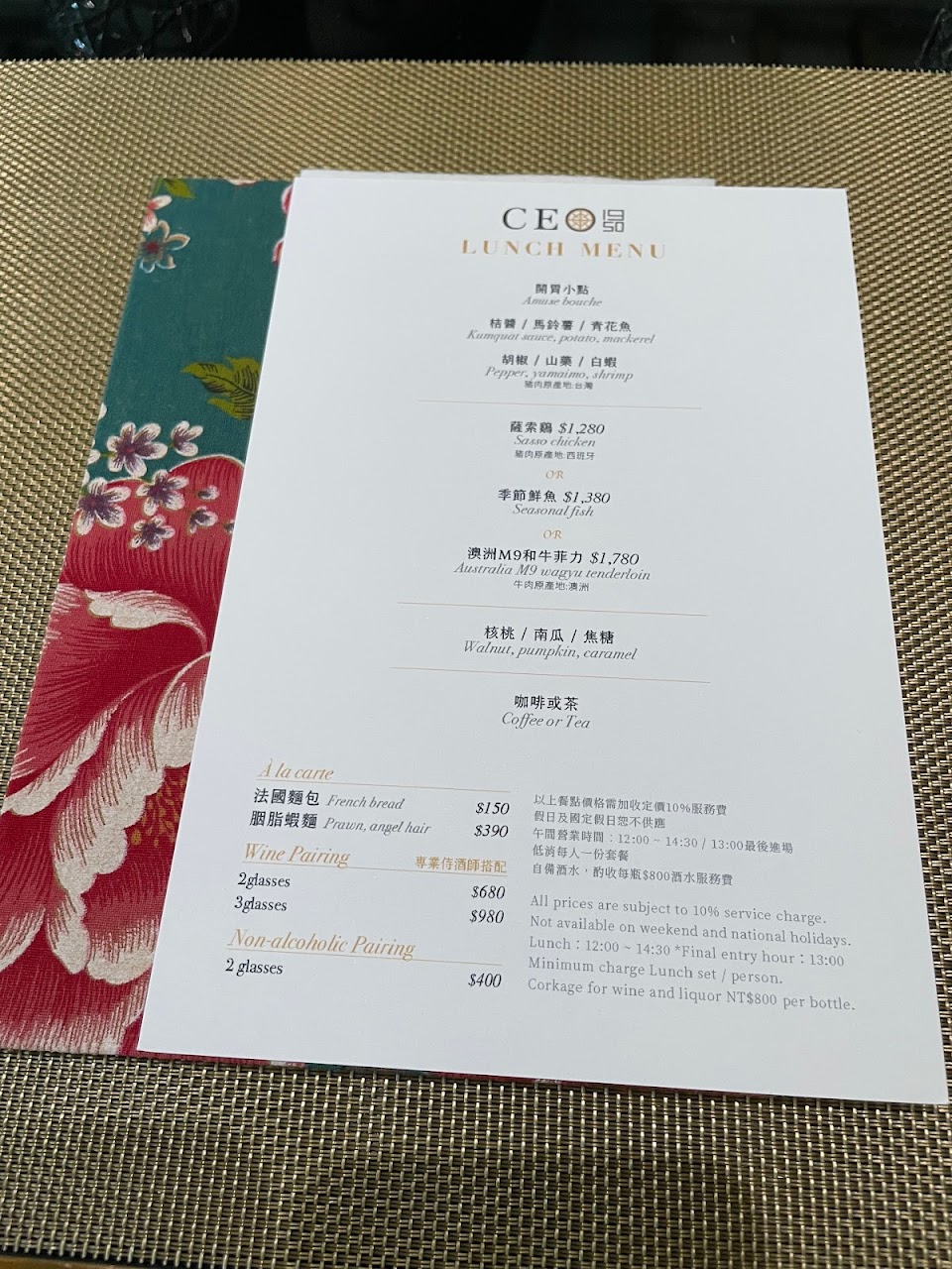搭配的餐酒都好喝、胭脂蝦麵超好吃、和牛也煎得剛剛好、鳳梨口味的甜點搭配不甜的巧克力跟蛋白餅很適合夏天、特別訂的伯爵茶口味生日蛋糕不甜但有伯爵茶香味好吃,最後的茶點是布列塔尼餅跟生巧克力也很棒~