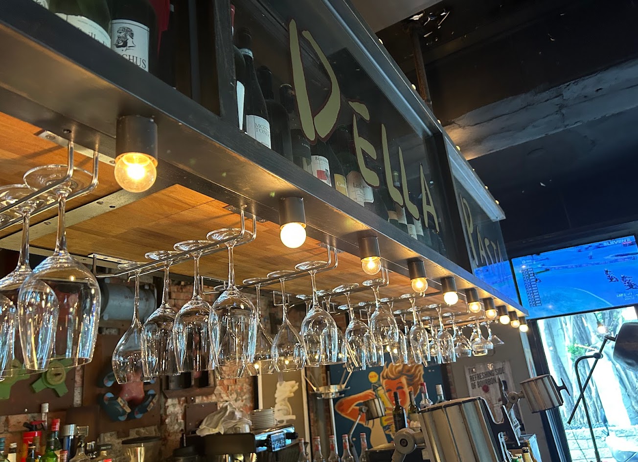 現代風磚砌餐廳,附設酒吧,供應義大利麵、披薩及其他豐盛的義式餐點。