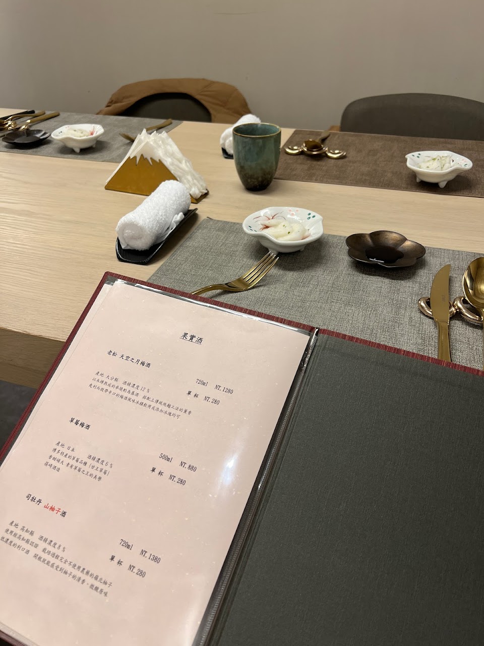 餐點:是無菜單料理,食材新鮮多樣,每一道上來都先滿足視覺上的感官,擺盤配色很上鏡,唯一的小遺憾是調味的部分,有多樣餐點吃起來口味都帶甜味,例如干貝蛋塔,岡山生蠔和牛漢堡的麵包的部分,吃起來很像脆皮泡芙的外皮的口感,也許有些人會覺得喜歡,但自己比較吃不習慣。最喜歡第一道的生魚片和日本山形縣和牛,和牛搭配的蒜泥味增醬很好吃。