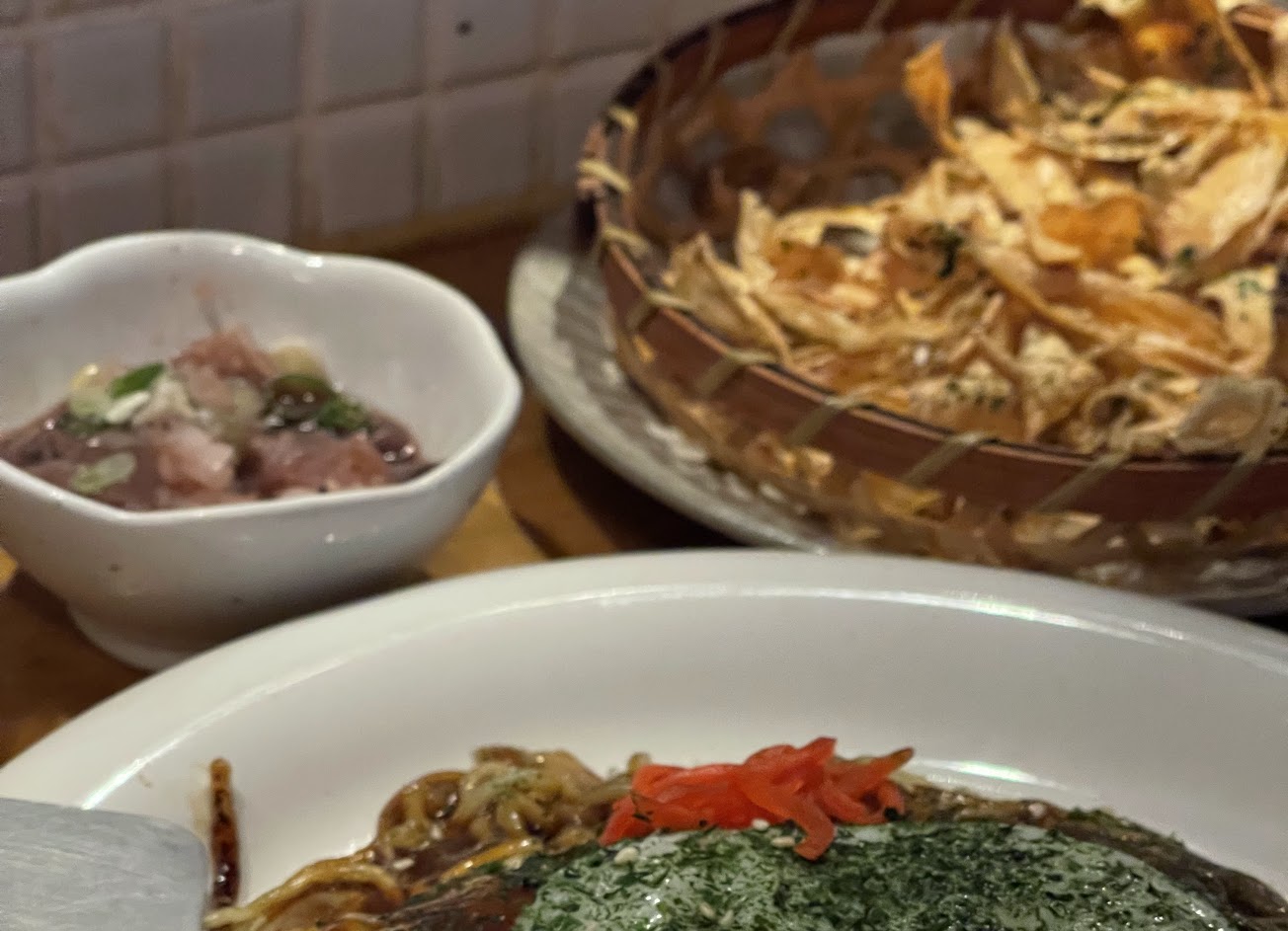 食物份量不算多,但都很精緻!點了招牌的雞肉丸、廣島燒,雞肉丸非常嫩,沾生蛋黃讓味道更濃郁。廣島燒還會給你小鏟子,方便切,旁邊也有提供美乃滋和其他醬料自己加