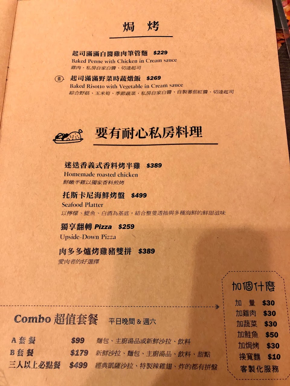 義大利麵算還行 ,但是套餐的紹興義大利麵味道有點清淡、西西里海鮮炸物頗讓人失望 、味道不夠也沒沾醬,套餐送的炸地瓜則是炸得太黑太硬…