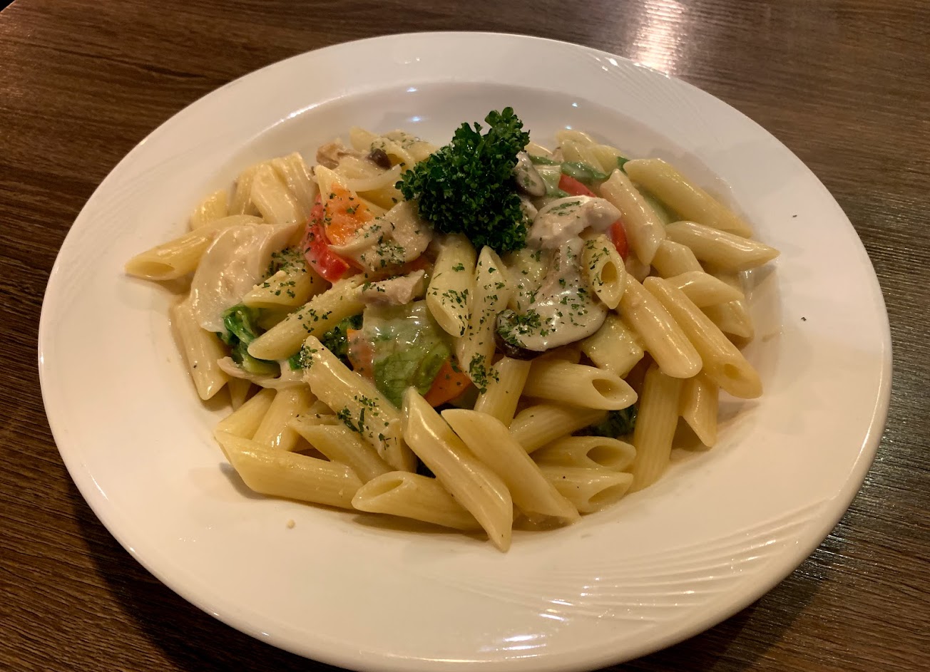 義大利麵醬汁濃郁不膩口、雞肉鮮嫩入味
