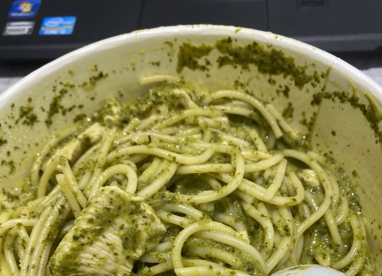 叫熊貓外送,青醬雞肉義大利麵,還以為應該會配點色給些蔬菜,雞肉又小又薄又給的少,自己才吃了三四塊就沒了,剩的都是肉末,青醬的味道是不錯,不過醬與麵的味道完全分開,不知道我吃的是拌麵?還是義大利麵⋯?