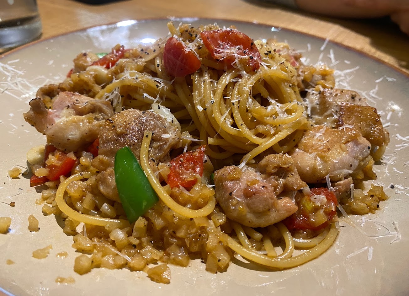 義大利麵是偏硬的口感,雖然說是辣醬調味但是整體不會太辣,節瓜有解膩的效果,魷魚給了不少,蠻好吃的就是有一點油,份量大概一個女生吃ok,大食量可能會吃不夠。