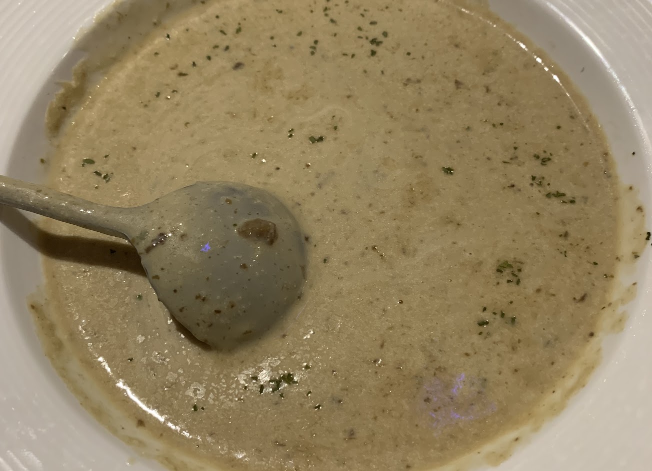 Pizza很美味,牛腩口味的是先將肉清燉到軟爛加到烤好的pizza 上淋上特調cheese 醬跟芹菜。牛腩份量很多,口味比較清淡但細細品嚐可以吃得出食材味道,搭配自製辣油增添層次。雖然說是辣油但不太辣(本身可以吃小辣)香氣跟微麻的感覺比較多。法式菌菇濃湯沒有一般看到的那麼濃,也好不然喝下很多澱粉。感覺比清湯濃一些但不至於到勾勾的,雖然偏清淡但越喝約順口。而且湯非常燙,剛上桌還有一團熱氣一直冒出,非常喜歡這種溫度。整體價格偏高,但用料不手軟且很多都是需要功做出的,值得推薦