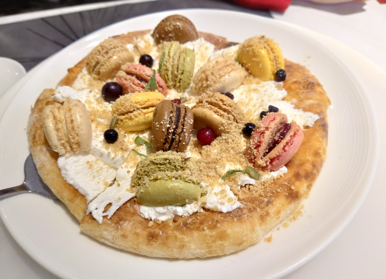 這次點了兩人套餐加點戰斧豬排餐,非常的飽,甜點馬卡龍披薩讓人驚艷,主角馬卡龍好吃不用說,下面餅皮也是鬆軟好吃不會覺得很多餘,而且擺起來真的是蠻好看的,若是單獨買來當慶生蛋糕也很適合。
