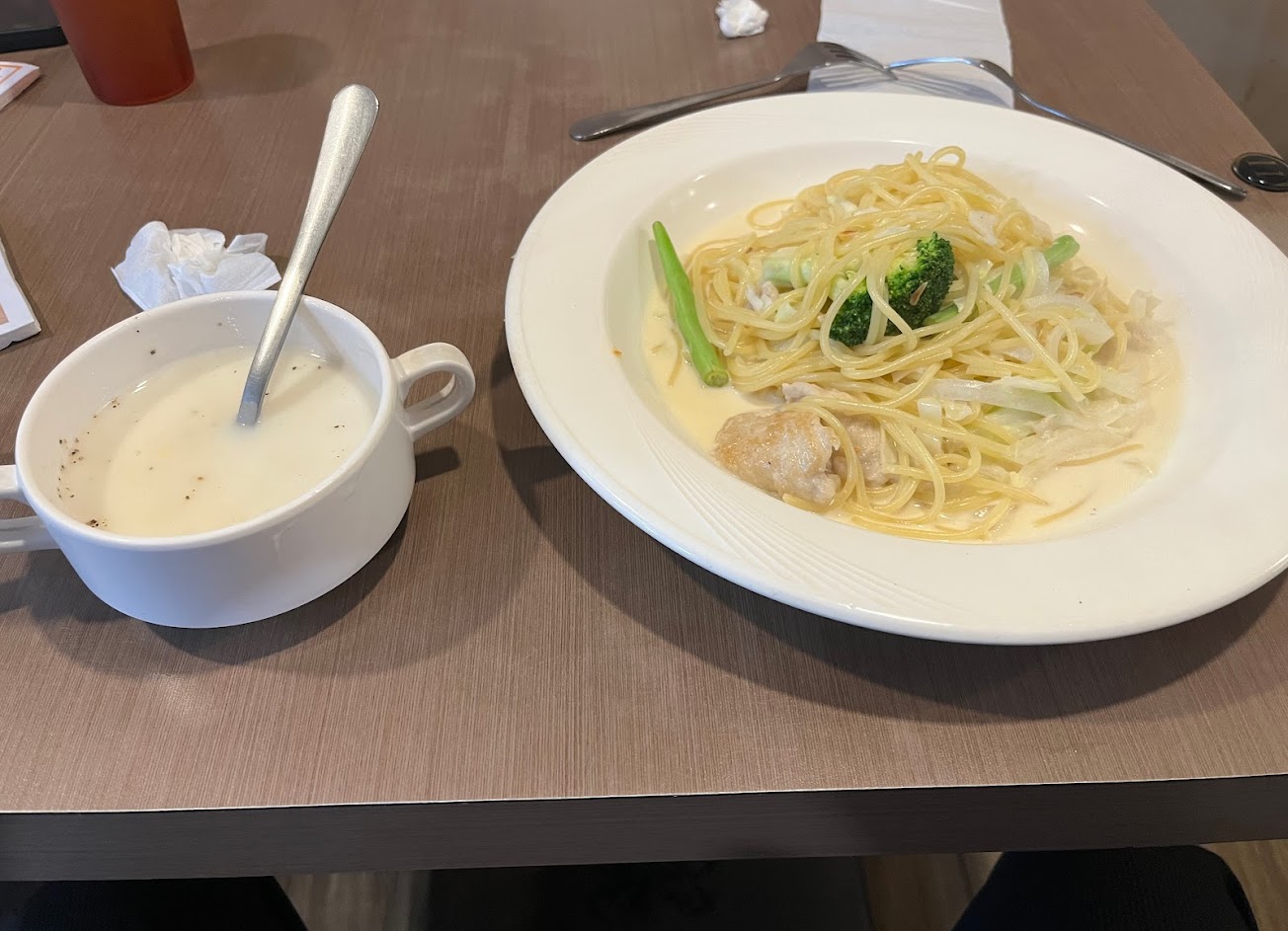 價格平價份量也大,義大利麵口味很不錯,內用還有飲料跟濃湯可以續,濃湯是奶白色的但沒什麼味道,味道普普,空間也算大可以好好的吃飯休息,不管是午休來吃飯或是聚餐都是好選擇