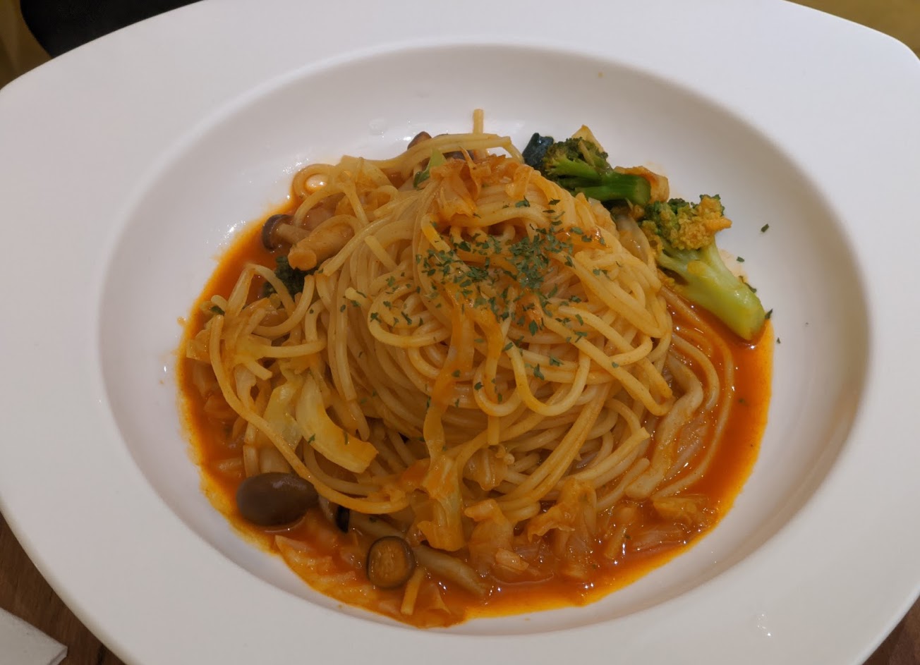 點了茄汁海鮮總匯義大利麵,料還算豐富,不過茄汁醬實在平淡無味,麵本身也普普,實在不算是個及格的義大利麵