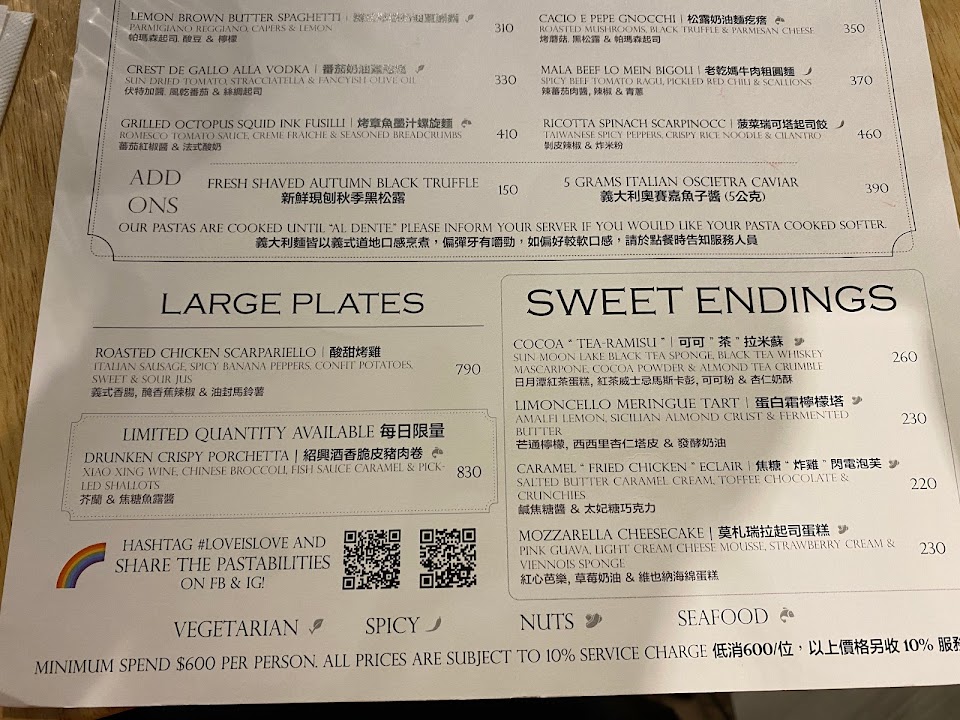 今天3人,點了脆皮豬肉卷、頂級牛肉塔塔、台式辣味牛肉義大利麵、起士鍋、碳烤青花菜沙拉,每一道都非常好吃。最愛的當屬碳烤青花菜沙拉和脆皮豬肉卷。