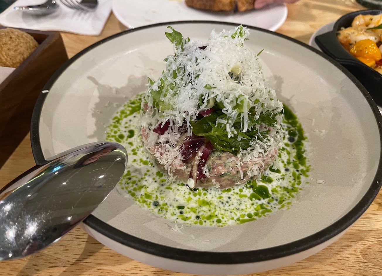 韃靼牛肉好吃,屬於偏酸的冷盤,搭配類似豆皮的脆皮小球食用,但味道跟我們點的另一道沙拉可以說是一模一樣,所以我們等於吃了兩盤味道一樣的餐點,吃得很膩。雞冠麵口感算有趣,但一整盤沒有其他層次與食材,只有醬料與麵,兩人分食仍然因為太膩太扁平而吃不完。