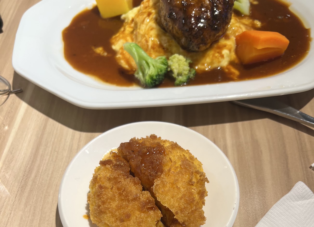 2023/02/23,漢堡排多汁厚實很推薦,蛋包飯,蛋皮滑嫩且薑黃飯粒粒分明,必吃濃郁起司可樂餅跟炸巨大廣島牡蠣,炸豬排一般般,價位有點高,但值得偶爾犒賞自己,有電子支付(但四人以上不能分開結帳)
