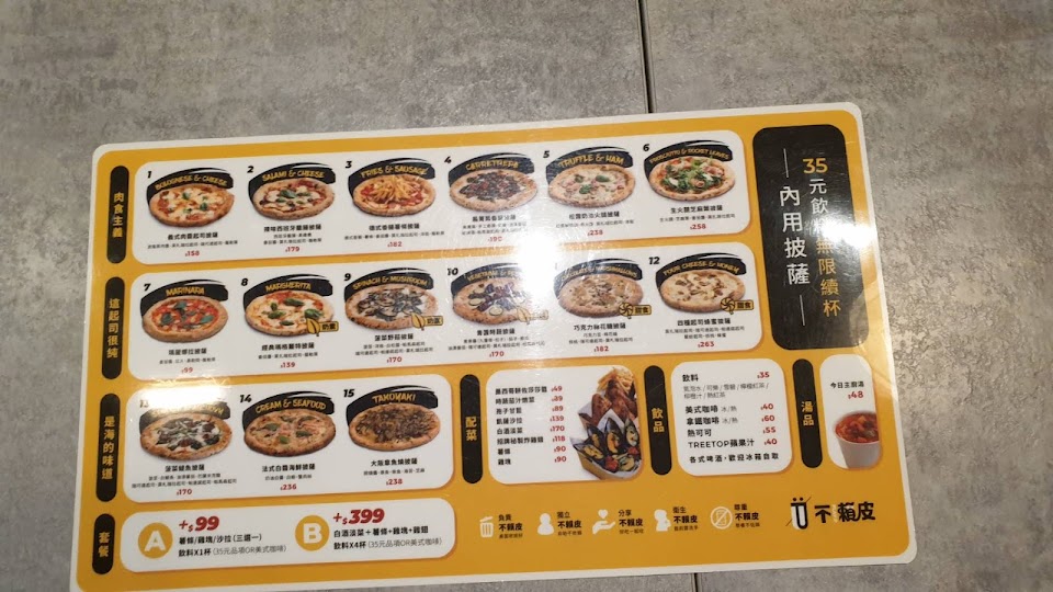 四種起司蜂蜜披薩263-不推,吃起來沒有層次,搭配的也不好; 瑪格麗特披薩139-中規中矩的口味,醬汁不會太酸,可自行加起司粉點綴; 餅皮都是軟的,沒有薄脆的要素; 飲料可無限續杯,柳橙汁比較好喝;環境還蠻寬敞的。