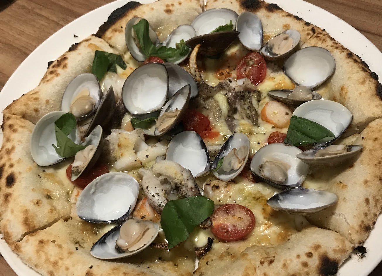 披薩是薄餅皮,最驚豔的是海鮮披薩有滿滿的帶殼新鮮蛤蠣,另一款店家推薦有半熟蛋在披薩正中央也很特別,是有鹹豬肉的口味,披薩份量大概是9片(9吋)⋯名字也忘了,我喜歡海鮮口味多一點~這兩個口味都是熱門的選擇!