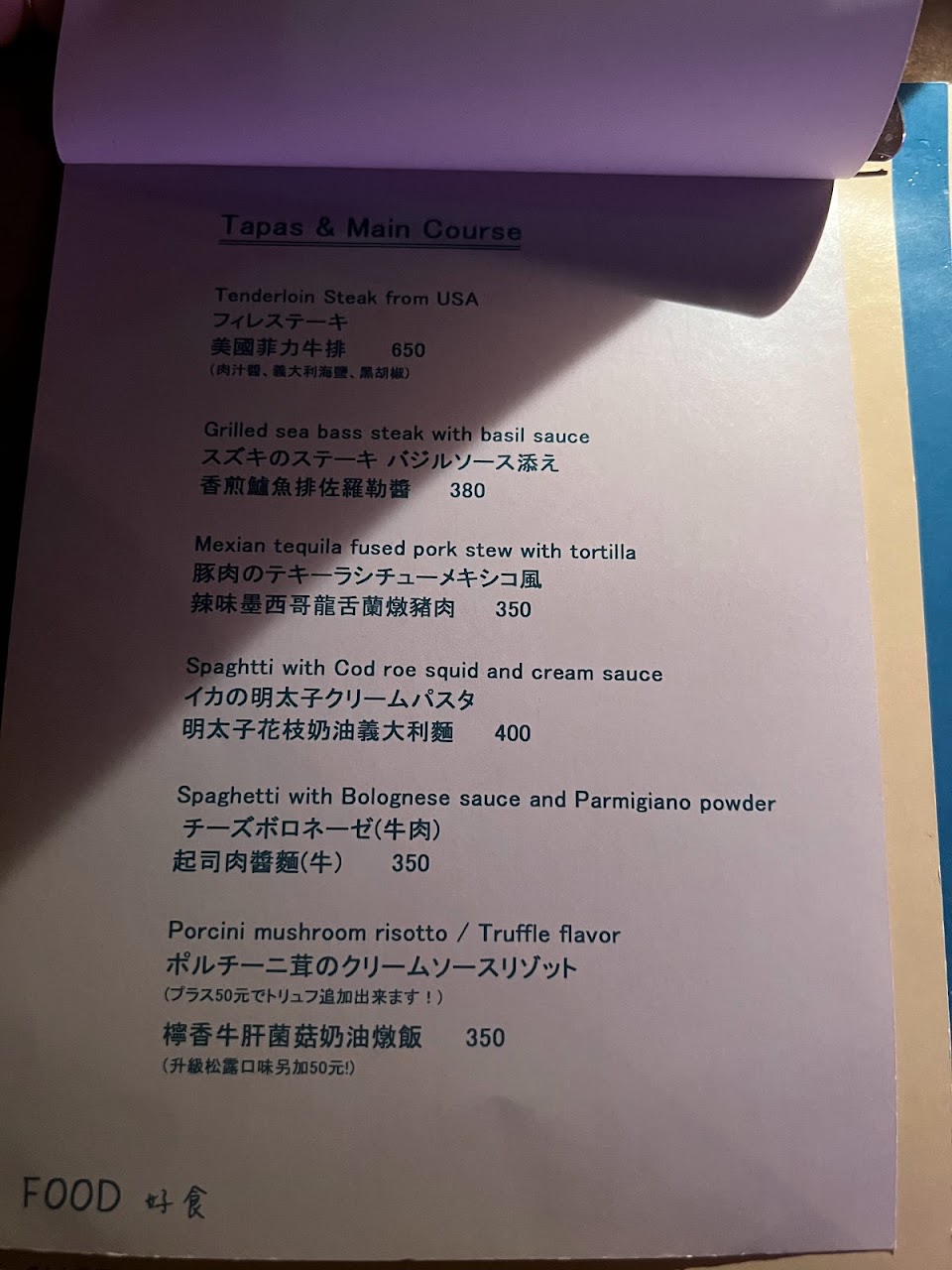 繼續第二攤,偏氣氛較吵鬧的bar,服務人員滿親切的,假日低消500,吧台上有水族箱覺得很特別,menu設計的部分很喜歡,圖示頗有可愛感❤️